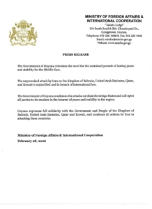 Guyana expresses full solidarity with the Government and People of the Kingdom of Bahrain, United Arab Emirates, Qatar and Kuwait, and condemns all actions by Iran in attacking these countries.